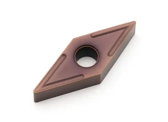 Rombikus, kétélű keményfém esztergalapka közepes esztergálási műveletekhez. Az MS forgácstörő geometria kiegyensúlyozott forgácsképzést és stabil forgácsolást biztosít.